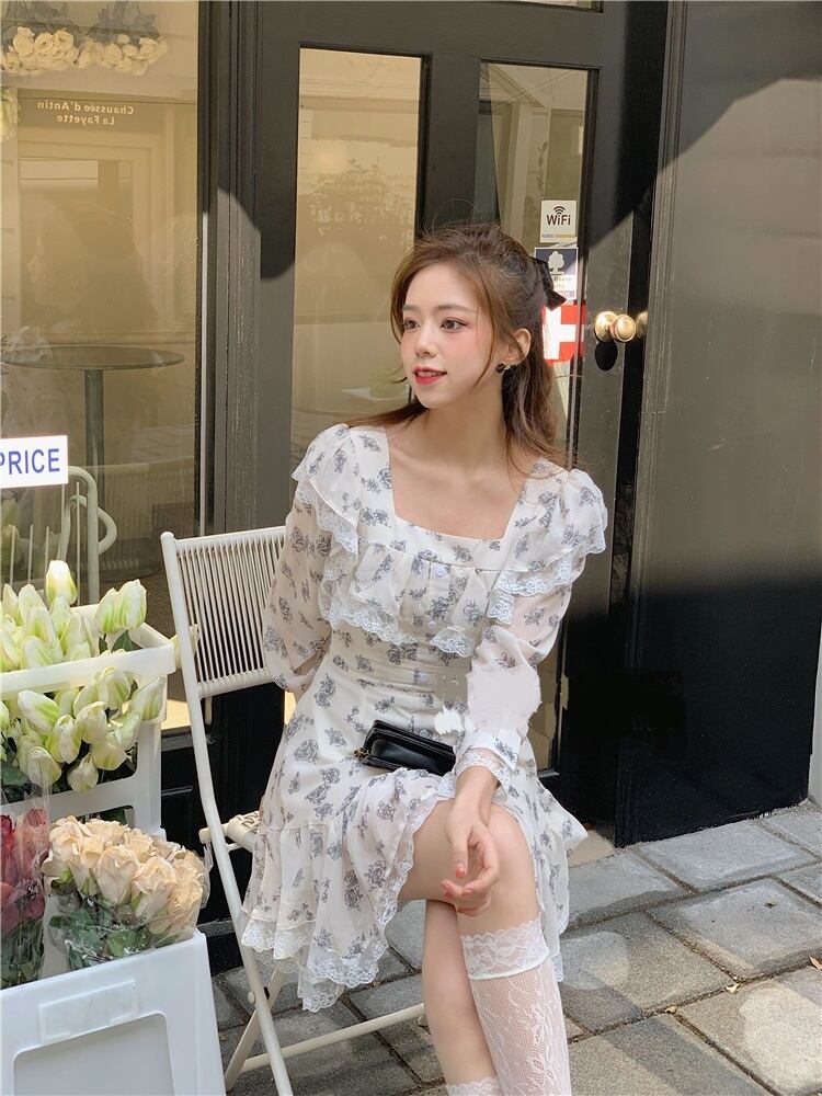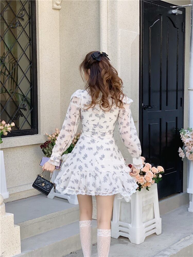 ワンピース カットソー オールインワン 白シャツ シャツワンピース フロントボタン ショート丈 膝上 袖あり 長袖 スクエアネック 襟なし セミフレア Aライン フリル 前開き ポリエステル かわいい カジュアル ラブリー キュート ガーリー 小花柄 春 夏 秋 10代 20代 学生 デート お出かけ 休日 パーティー 海 楽ちん サイズ S M L 色展開 ベージュ | Raforea
