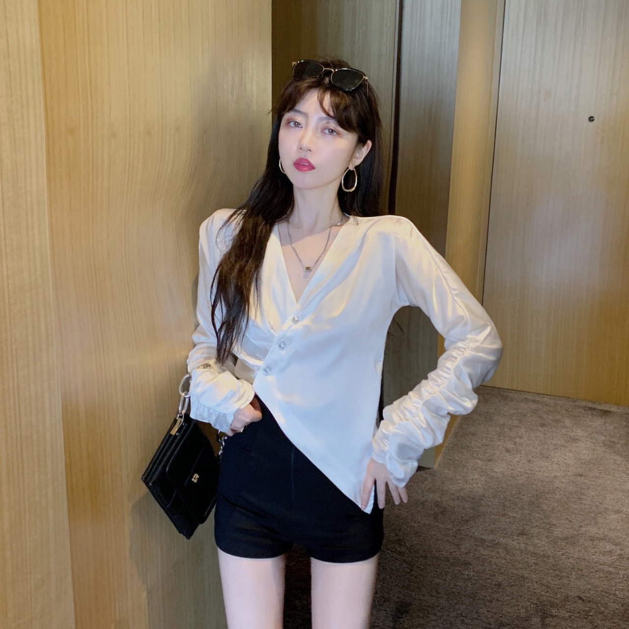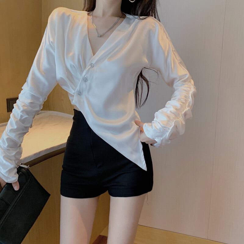 トップス ブラウス クロップド 白トップス フロントボタン アシンメトリー 袖あり 長袖 Vネック 襟なし ストレート Iライン 前開き 2way 薄手 大人可愛い カジュアル 大人 かっこいい 大人女子 フォーマル 無地 春 夏 秋 10代 20代 オフィス OL 通勤 お出かけ イベント ir サイズ S M L 色展開 ホワイト | Raforea
