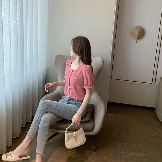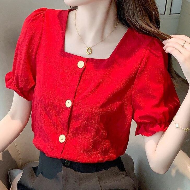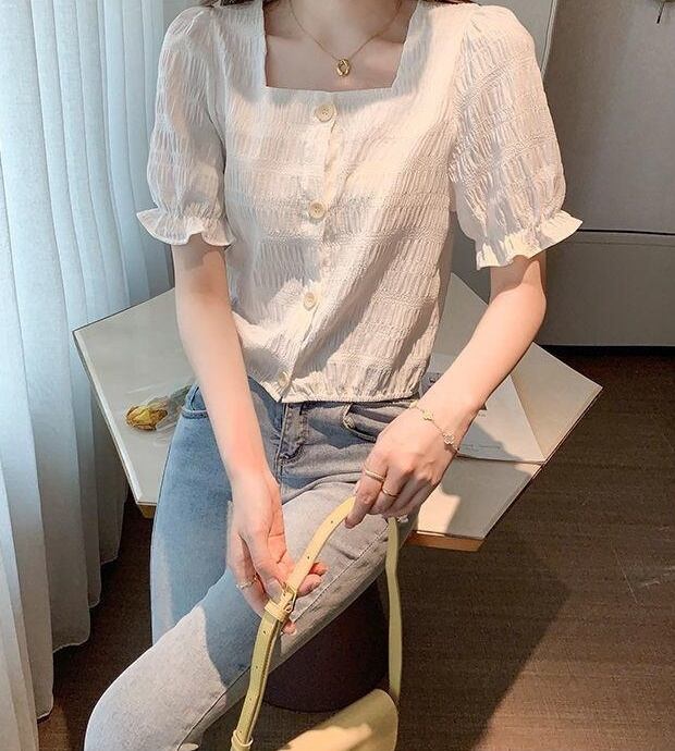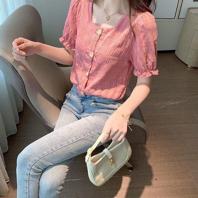 トップス シャツ ブラウス ショート丈 クロップド丈 袖あり 半袖 パフスリーブ スクエアネック スリム シフォン 前開き 透け感 薄手 かわいい 大人可愛い きれいめ シンプル カジュアル 大人 上品 お洒落 大人女子 こなれ感 ガーリー 主役級 とろみ感 抜け感 無地 春 夏 20代 30代 40代 ママ 通勤 通学 デート お出かけ 女子会 休日 旅行 着回し 普段使い 韓国系 オルチャン モテ 脚長 定番 トレンド インスタ映え S M L XL ピンク ホワイト レッド | Raforea