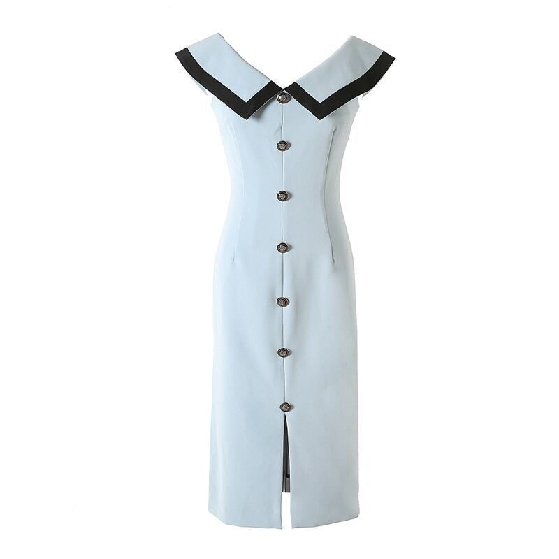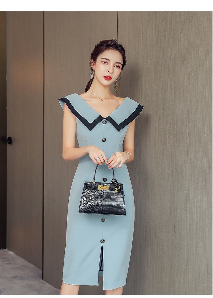 ビッグカラー ワンピース ワンピドレス ミディアム丈 袖なし ノースリーブ Vネック スリム タイト 細身 スリット かわいい 大人可愛い 大人 上品 おしゃれ お洒落 レトロ 大人可愛い 大人女子 こなれ感 個性的 主役級 春 夏 結婚式 二次会 披露宴 10代 20代 30代 レディース 女性用 デート お出かけ パーティー イベント 韓国 韓国系 ファッション コーデ スタイル モテ トレンド 流行 インスタ映え S M L XL 青 ブルー | Raforea
