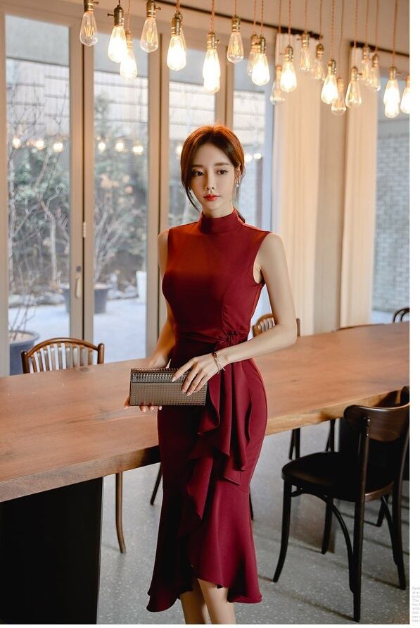 ワンピース ワンピドレス ミモレ ミディアム丈 袖なし ノースリーブ スタンドカラー スリム タイト フリル リボン ウエストリボン 大人可愛い シンプル 大人 上品 おしゃれ お洒落 大人可愛い 大人女子 こなれ感 セクシー エレガント 主役級 フォーマル 無地 春 夏 謝恩会 結婚式 二次会 披露宴 10代 20代 30代 レディース 女性用 パーティー イベント 韓国 韓国系 ファッション コーデ スタイル モテ インスタ映え S M L XL 黒 ブラック 赤 レッド | Raforea