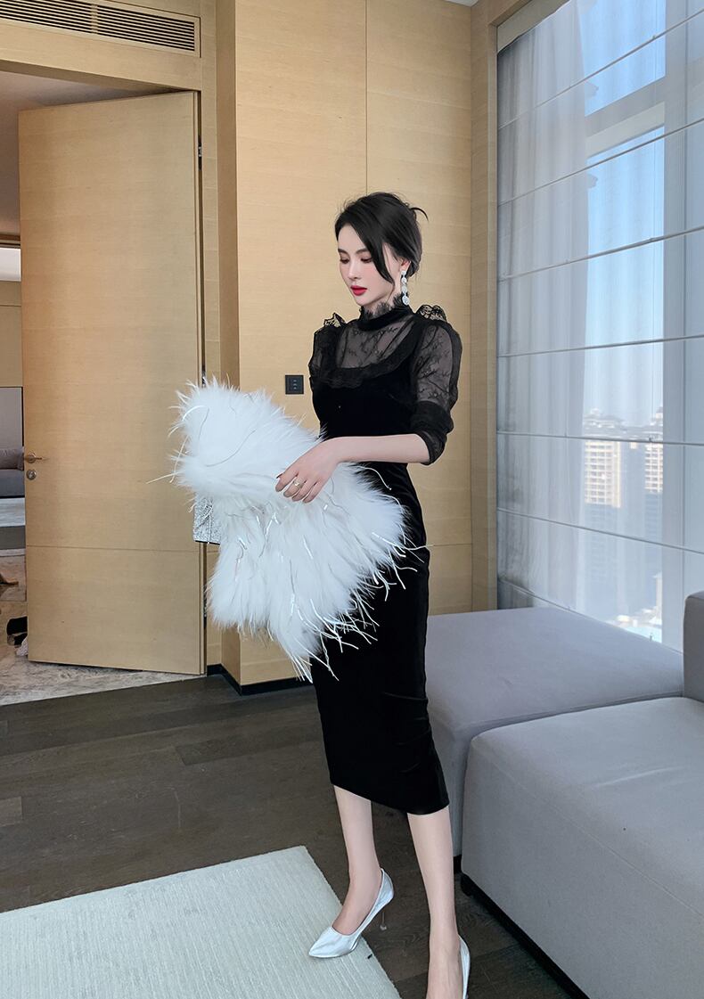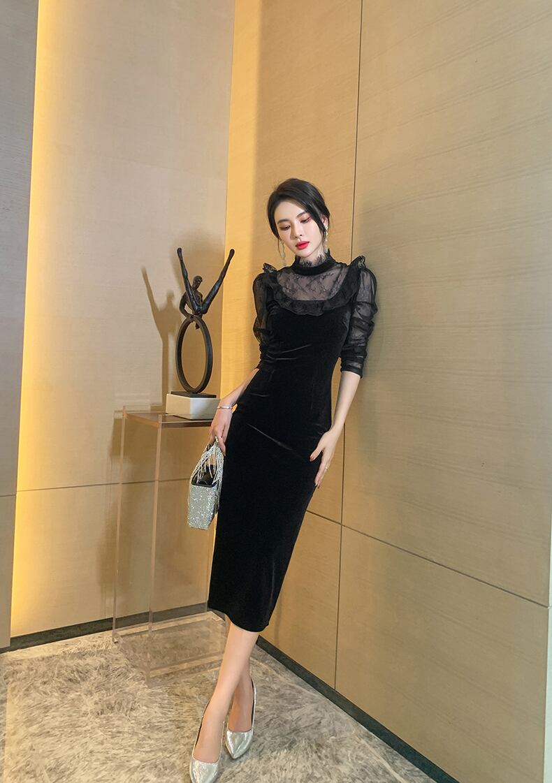 シアー素材のレースにベロア調生地の異素材MIXな長袖ワンピース。
