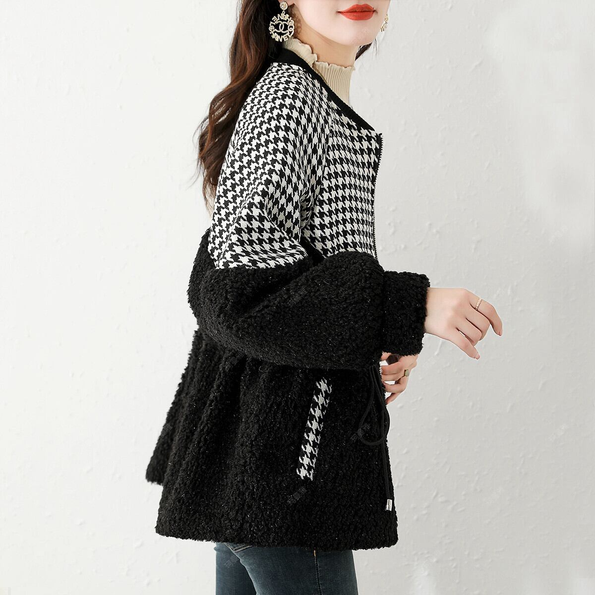 千鳥格子とボアの切り替えがインパクトのあるジャケット。