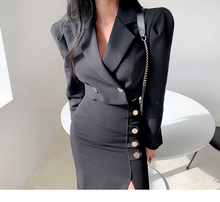 スカート ジャケット スーツ ワンピドレス 膝下 ミモレ丈 ミディアム丈 袖あり 長袖 Vネック 襟付き スリム タイト 細身 スリット サイドスリット ハイウエスト 上下セット 2点セット ツーピース きれいめ 大人 おしゃれ かっこいい レトロ エスニック エキゾチック 大人女子 こなれ感 個性的 クール モード系 セクシー モダン 主役級 存在感 無地 春 レディース ビジネス OL 通勤 学生 通学 美脚 脚長 インスタ映え S M L XL 黒 ブラック | Raforea