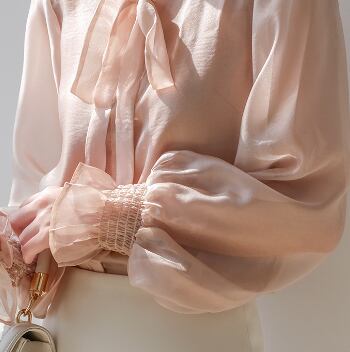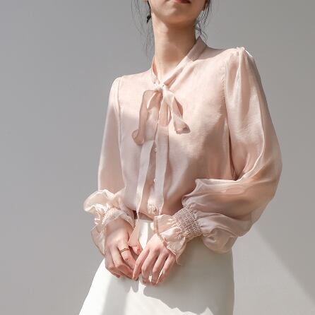 トップス ブラウス 袖あり 長袖 ボリューム袖 パフスリーブ 萌袖 Uネック 襟付き スタンドカラー チュール シフォン フリル リボン ふわふわ 透け感 かわいい 大人可愛い きれいめ シンプル 大人 上品 おしゃれ お洒落 大人可愛い 大人女子 こなれ感 キュート ガーリー エレガント モダン 主役級 存在感 無地 入学式 入園式 レディース OL 通勤 デート お出かけ 女子会 休日 着回し 普段使い オルチャン ファッション コーデ インスタ映え ピンク パステルカラー | Raforea