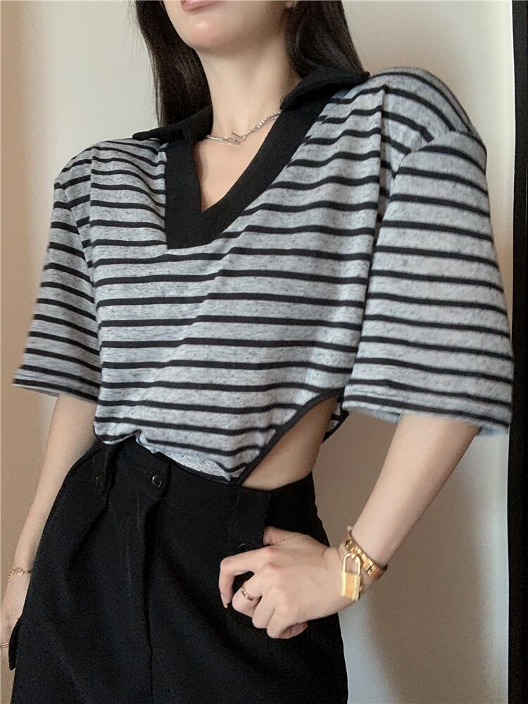 トップス Tシャツ シャツ カットソー 袖あり 半袖 Vネック 襟付き スリット お得 かわいい シンプル カジュアル おしゃれ お洒落 かっこいい レトロ ラフ メンズライク ボーイッシュ キュート 個性的 モード系 存在感 ボーダー 春 夏 秋 ロングシーズン 10代 20代 30代 レディース 女性用 学生 デート お出かけ 公園 運動 ジム ヨガ アウトドア 旅行 ショッピング 着回し 普段使い 韓国 韓国系 オルチャン トレンド 流行 S M L XL ブラック グレー | Raforea