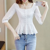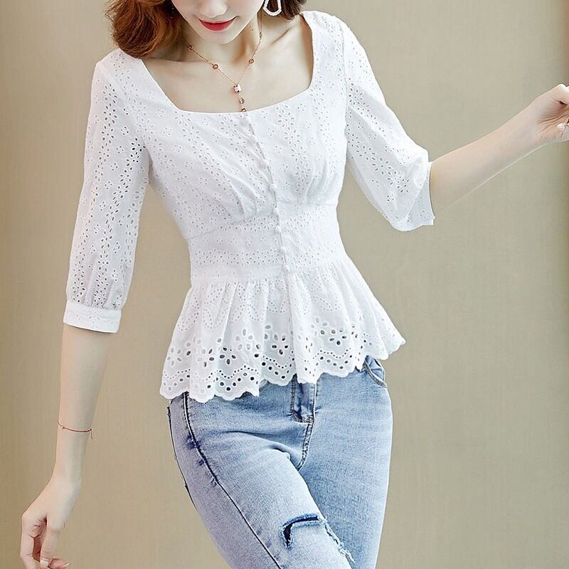 大きいサイズ 小さいサイズ トップス シャツ ブラウス 白シャツ 白トップス 袖あり 5分袖 五分袖 スクエアネック 襟なし ペプラム レース ウエストマーク ハイウエスト 透け感 ボタン 薄手 かわいい 大人可愛い きれいめ 大人 おしゃれ 清楚 大人女子 ラブリー キュート ガーリー 存在感 抜け感 無地 春 夏 10代 20代 30代 40代 レディース 女性用 ママ 学生 デート お出かけ 公園 女子会 休日 イベント 旅行 海 お茶会 ランチ ショッピング 着回し 普段使い モテ 体系カバー | Raforea