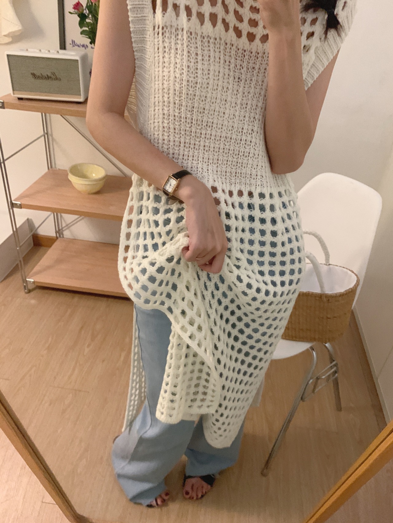 ワンピース ニットソー セーター メッシュニット 膝丈 ミモレ丈 ロング 袖なし Uネック 襟なし タイト ストレート Iライン 編み込み 伸縮性 メッシュ シンプル カジュアル 大人 レトロ アジアン 大人女子 こなれ感 ラフ 個性的 存在感 無地 春 夏 秋 20代 30代 40代 通学 お出かけ 女子会 お泊まり 休日 普段使い サイズ ワンサイズ 色展開 ブラック ベージュ | Raforea
