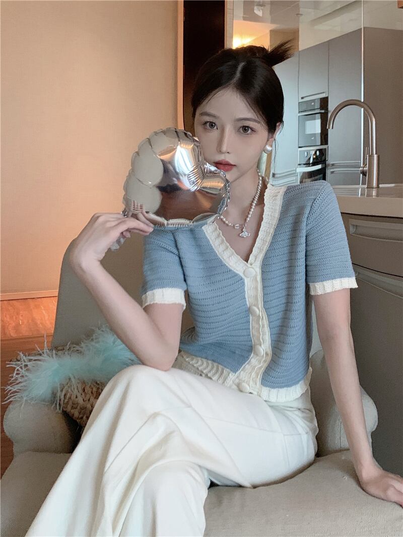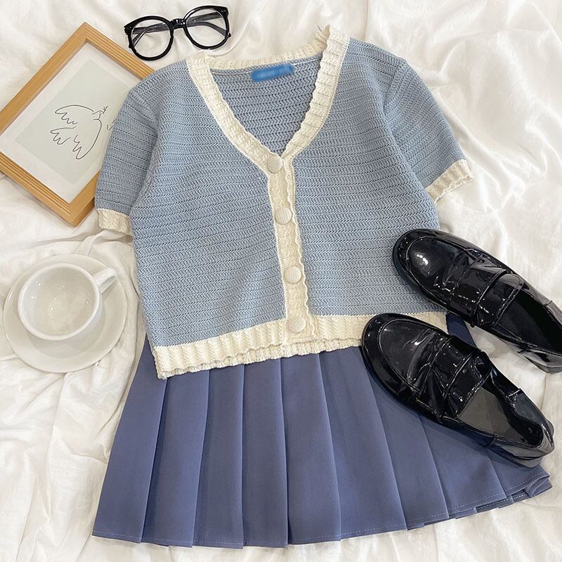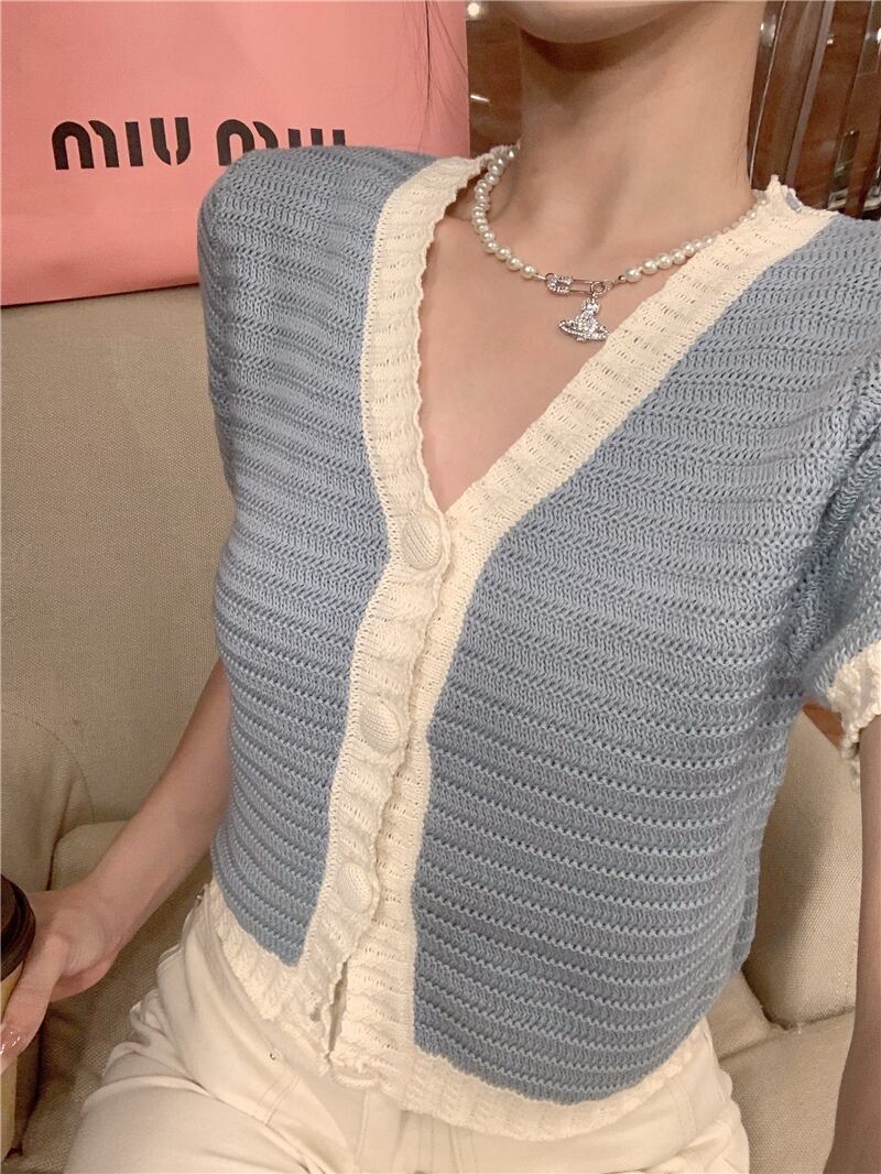 トップス ニットソー カーディガン フロントボタン 袖あり 半袖 Vネック 襟なし 細身 ストレート Iライン 前開き アクリル かわいい シンプル カジュアル レトロ アジアン ラブリー ガーリー 無地 春 秋 10代 20代 学生 通学 お出かけ 休日 普段使い 重ね着 コーデ 楽ちん サイズ ワンサイズ 色展開 スカイブルー | Raforea