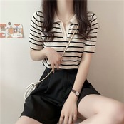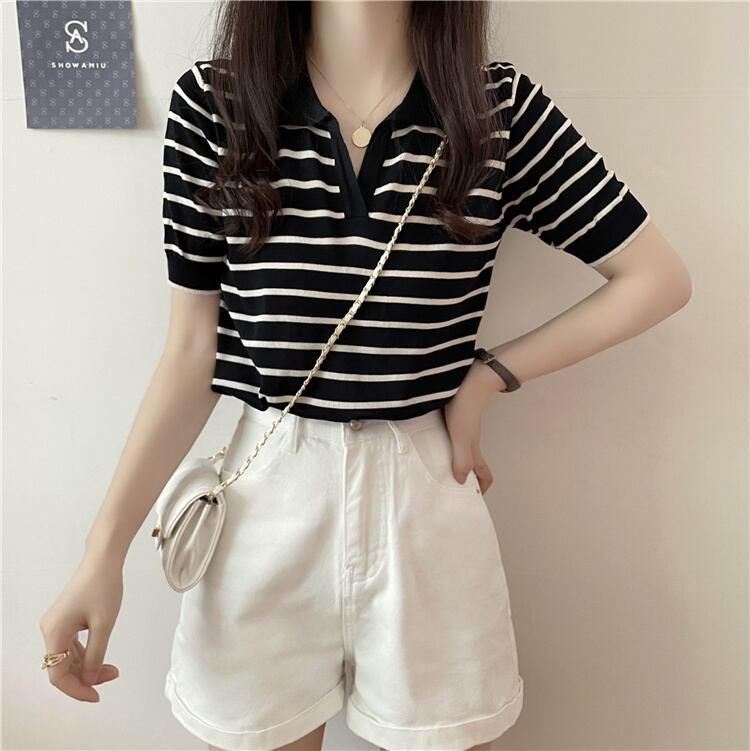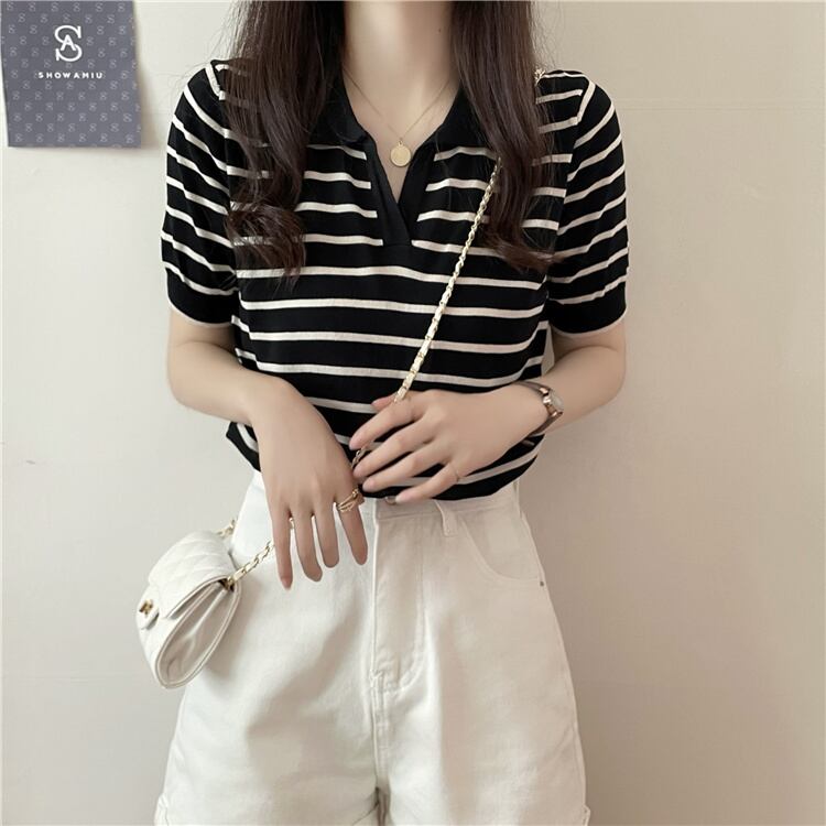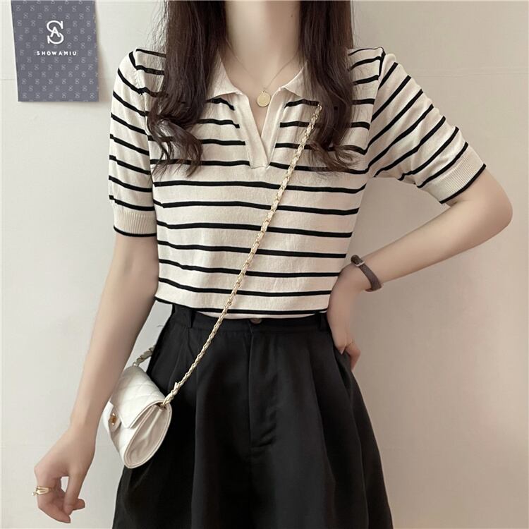 トップス Tシャツ カットソー 白トップス 袖あり 半袖 パフスリーブ Vネック 襟付き ストレート Iライン 薄手 シンプル レトロ アジアン ラフ ボーイッシュ 個性的 とろみ感 ストライプ 春 夏 秋 20代 30代 40代 50代 学生 通学 お出かけ 公園デビュー 女子会 お泊まり 休日 運動 普段使い サイズ S M L XL 色展開 ブラック アプリコット | Raforea
