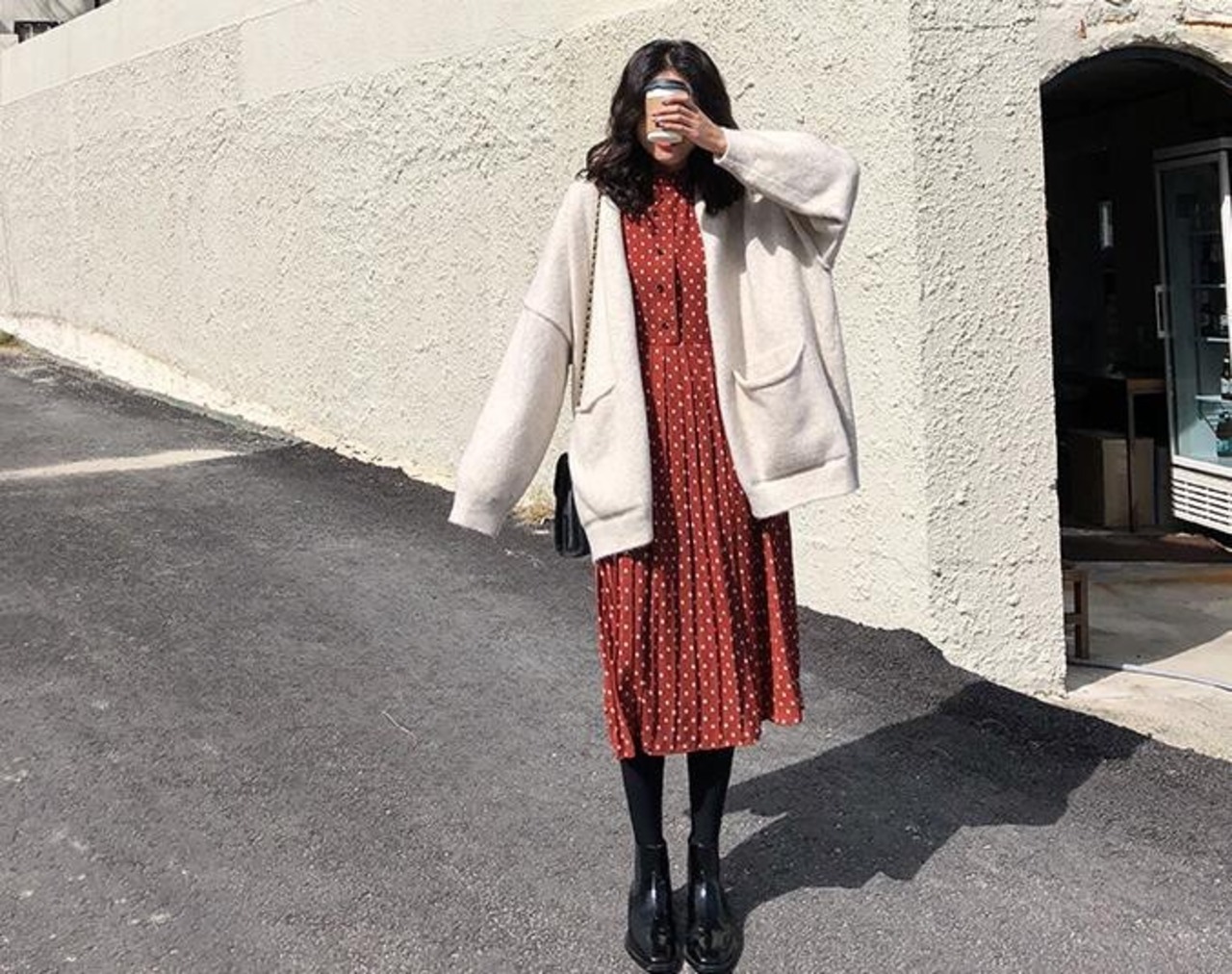 Mから4XLまで展開されてるワンピース。プリーツスカートが女性らしく、ドット柄がレトロな雰囲気もあり、秋冬に活躍します。
