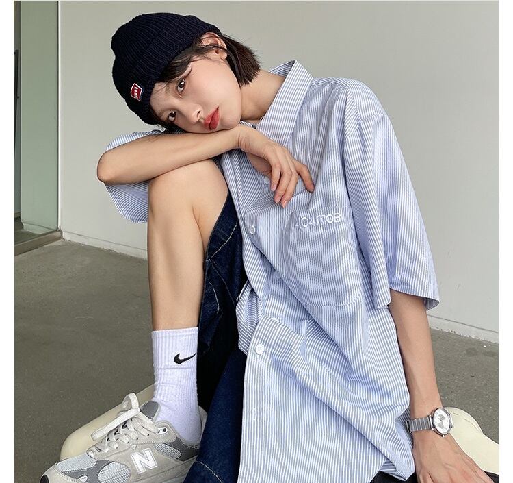 トップス ブラウス カットソー フロントボタン 袖あり 半袖 Vネック 襟付き ストレート ワイド 綿 ポリエステル シンプル カジュアル 大人 ラフ メンズライク クール ボーダー 春 夏 秋 10代 20代 30代 40代 学生 通学 お出かけ 女子会 休日 アウトドア 普段使い 定番 サイズ S M L XL 2XL 色展開 青 | Raforea