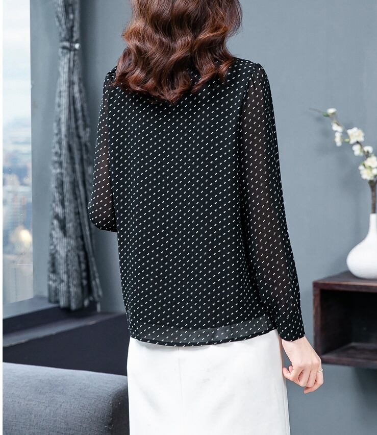 可愛くなりすぎないドット柄がフェミニンなボウタイシフォンブラウス。
