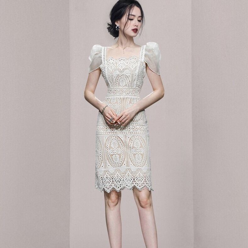 ワンピース ワンピドレス 膝丈 ひざ丈 膝上 袖あり 半袖 スクエアネック スリム タイト 細身 Iライン レース かわいい 大人可愛い きれいめ シンプル 大人 上品 おしゃれ お洒落 大人可愛い 大人女子 ラブリー キュート セクシー エレガント 主役級 存在感 柄 春 夏 秋 20代 30代 レディース 女性用 パーティー イベント 美脚 脚長 サイズ S M L XL 色展開 白 ホワイト | Raforea
