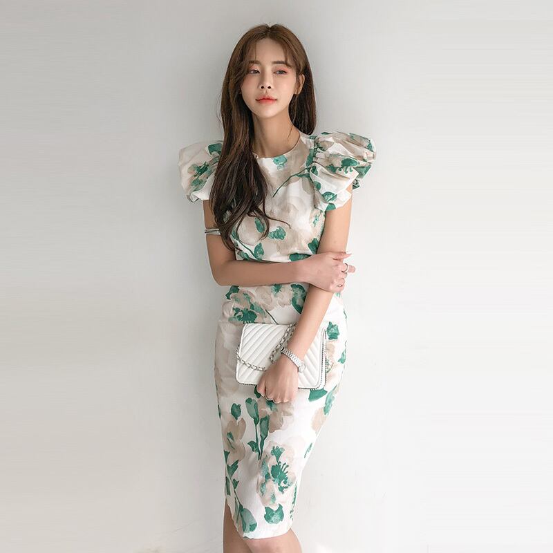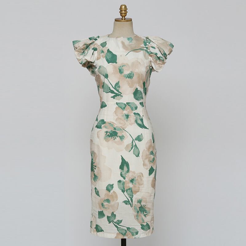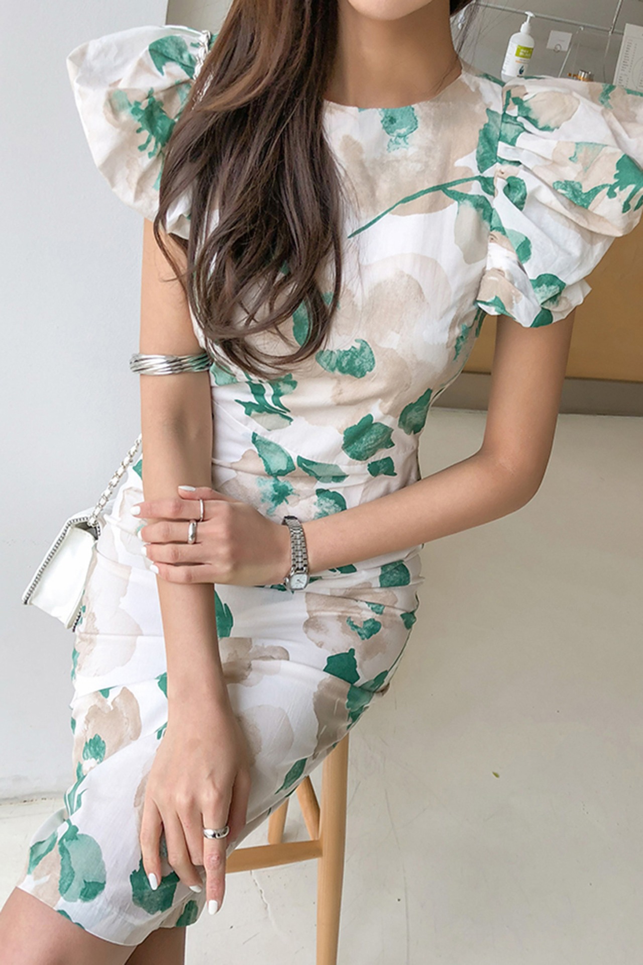 スカート ボトムス ワンピース ロングスカート ワンピドレス 膝丈 ひざ丈 ミディアム丈 袖あり 半袖 ボリューム袖 パフスリーブ ラウンドネック スリム タイト 細身 スマート シフォン ハイウエスト 大人可愛い きれいめ シンプル 上品 おしゃれ お洒落 エスニック 大人女子 こなれ感 ガーリー 個性的 主役級 存在感 柄 花柄 リーフ柄 ボタニカル 春 夏 秋 20代 30代 40代 レディース ビジネス OL 通勤 デート 女子会 パーティー イベント ホテル | Raforea