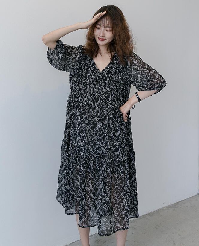 ワンピース マタニティワンピース シフォンワンピース ひざ丈 袖あり 5分袖 Vネック シフォン 透け感 シースルー 薄手 大人可愛い きれいめ カジュアル 大人 上品 お洒落 レトロ 大人女子 こなれ感 ラフ ガーリー ルーズ エレガント 主役級 抜け感 花柄 総柄 春 夏 秋 謝恩会 二次会 20代 30代 40代 ママ マタニティ 通勤 通学 デート お出かけ 女子会 休日 パーティー 旅行 普段使い 重ね着 楽ちん 体系カバー 定番 トレンド 流行 インスタ映え ブラック ホワイト グリーン | Raforea