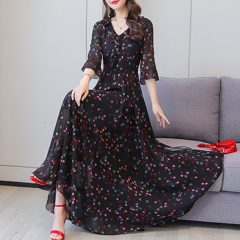 ワンピース フレアワンピース ロングワンピース 膝下 ロング ロング丈 マキシ マキシ丈 袖あり 半袖 5分袖 五分袖 ポエットスリーブ Vネック 襟なし Aライン フリル ウエストマーク かわいい 大人可愛い きれいめ 大人 上品 おしゃれ 清楚 大人女子 ラブリー キュート ガーリー 抜け感 柄 春 夏 秋 ロングシーズン 10代 20代 30代 40代 レディース 女性用 ママ 学生 デート お出かけ 公園 休日 パーティー イベント 旅行 ホテル レストラン お呼ばれ お茶会 ランチ | Raforea