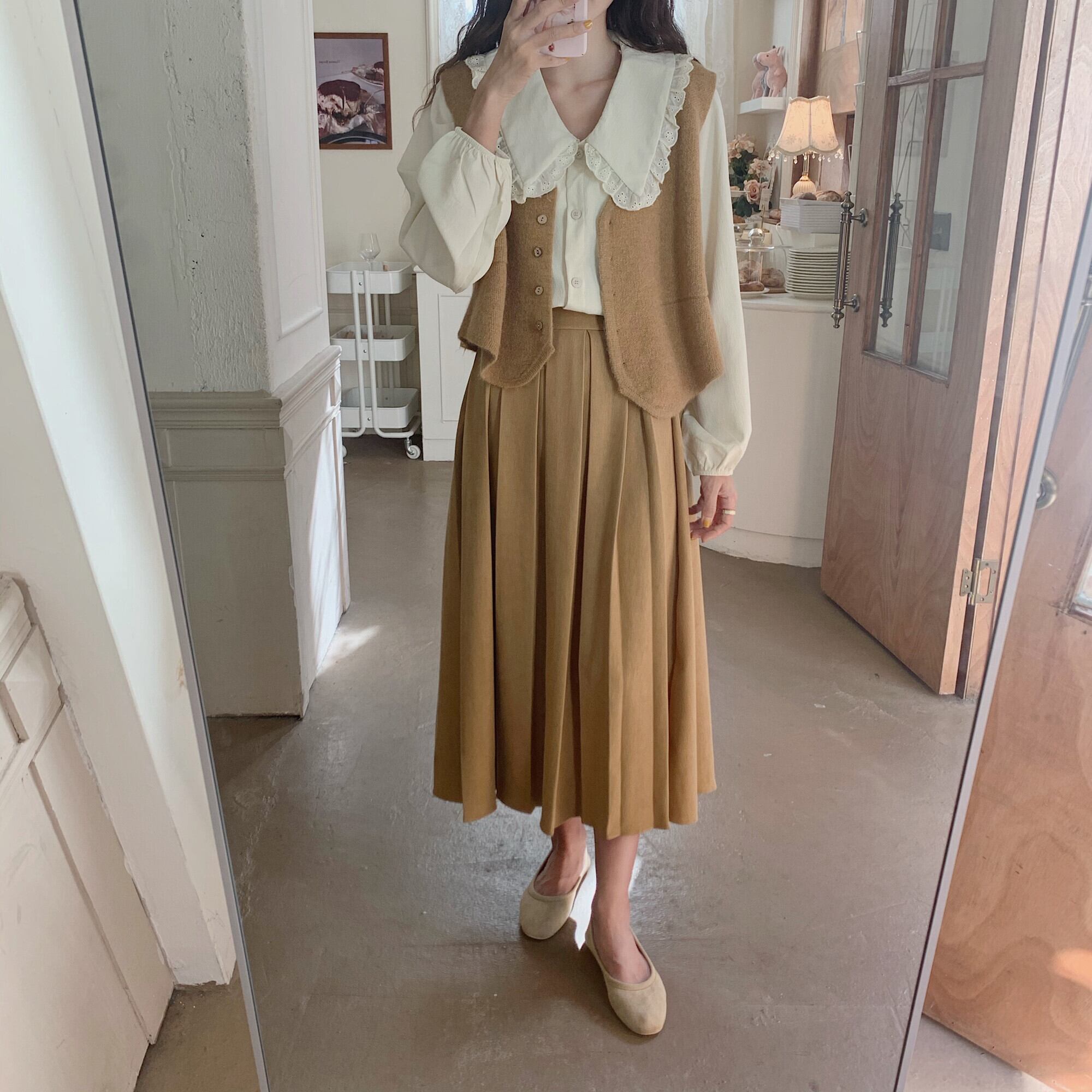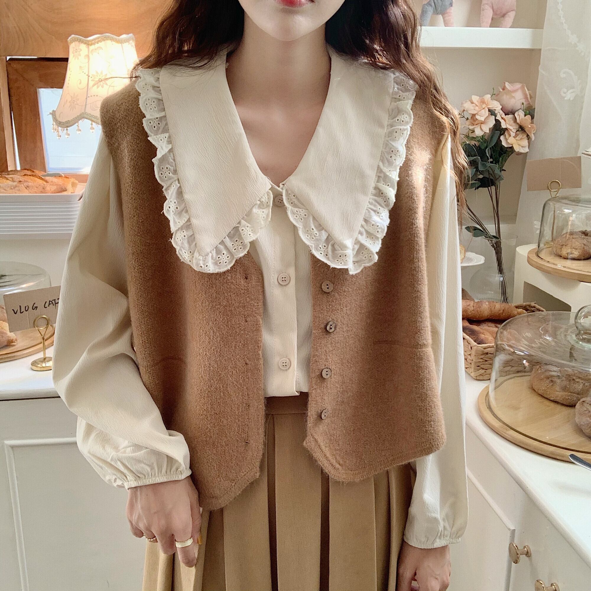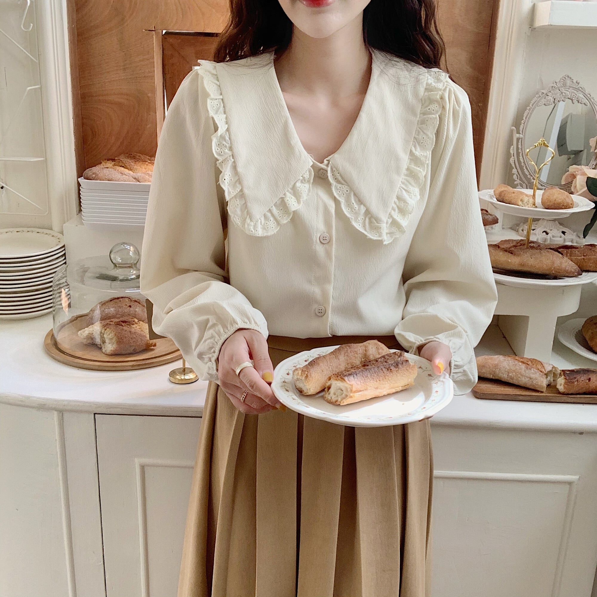 ナチュラルでガーリーなテイストのブラウス。大きめの襟が小顔効果があり、カーディガンなどと重ね着して頂くとよりおしゃれです。