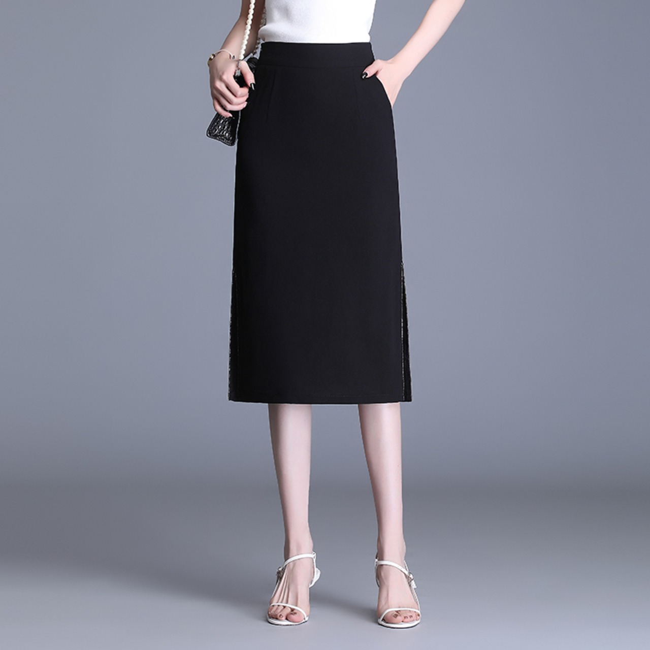 サイドスリットが足をきれいに見せてくれるひざ丈のスカート。